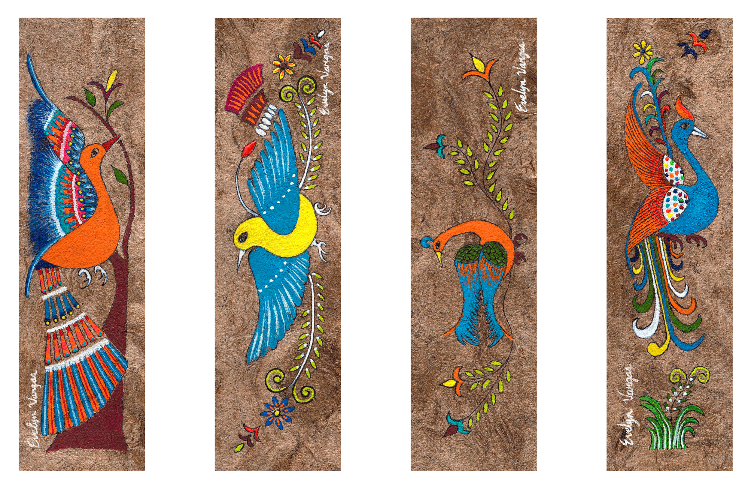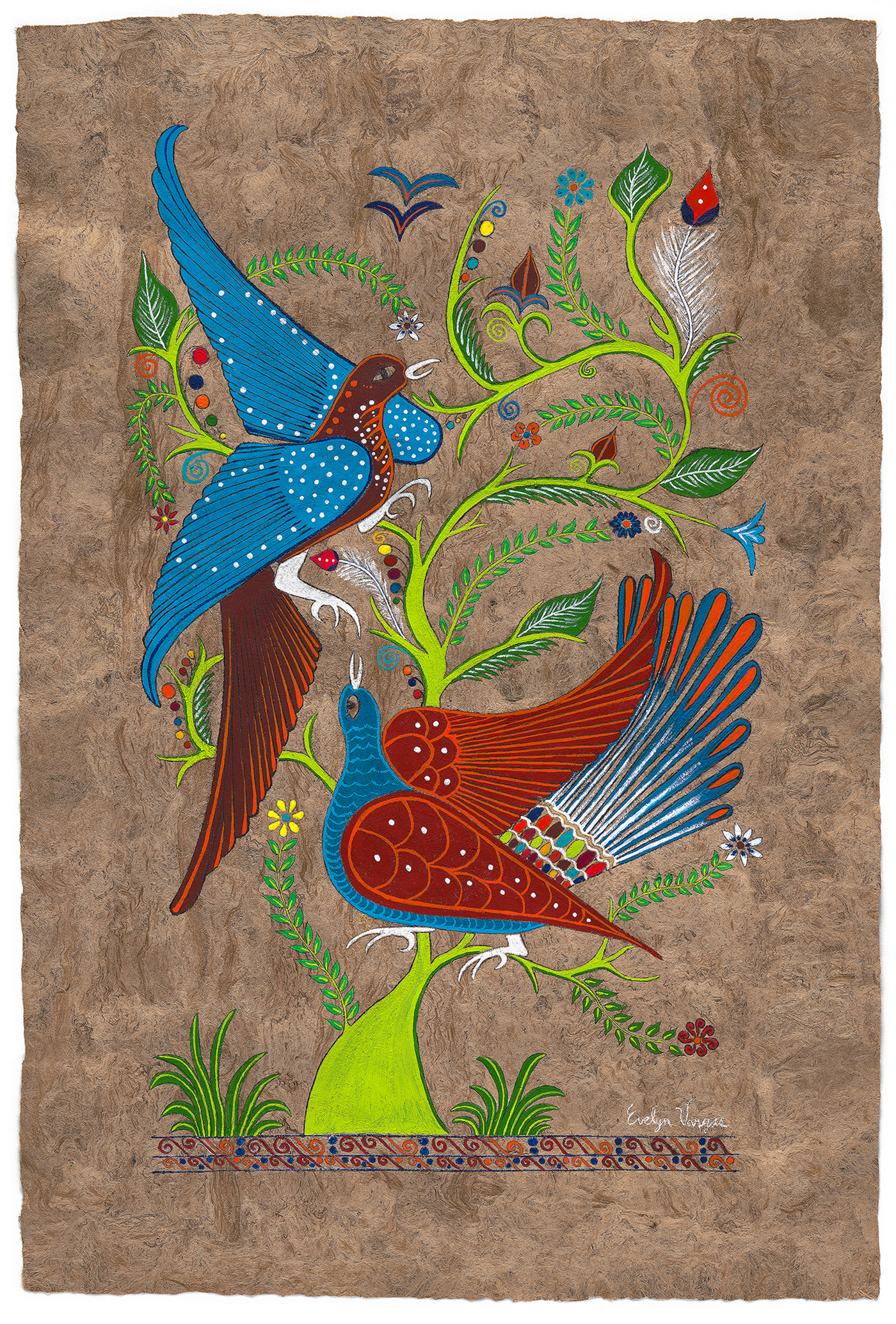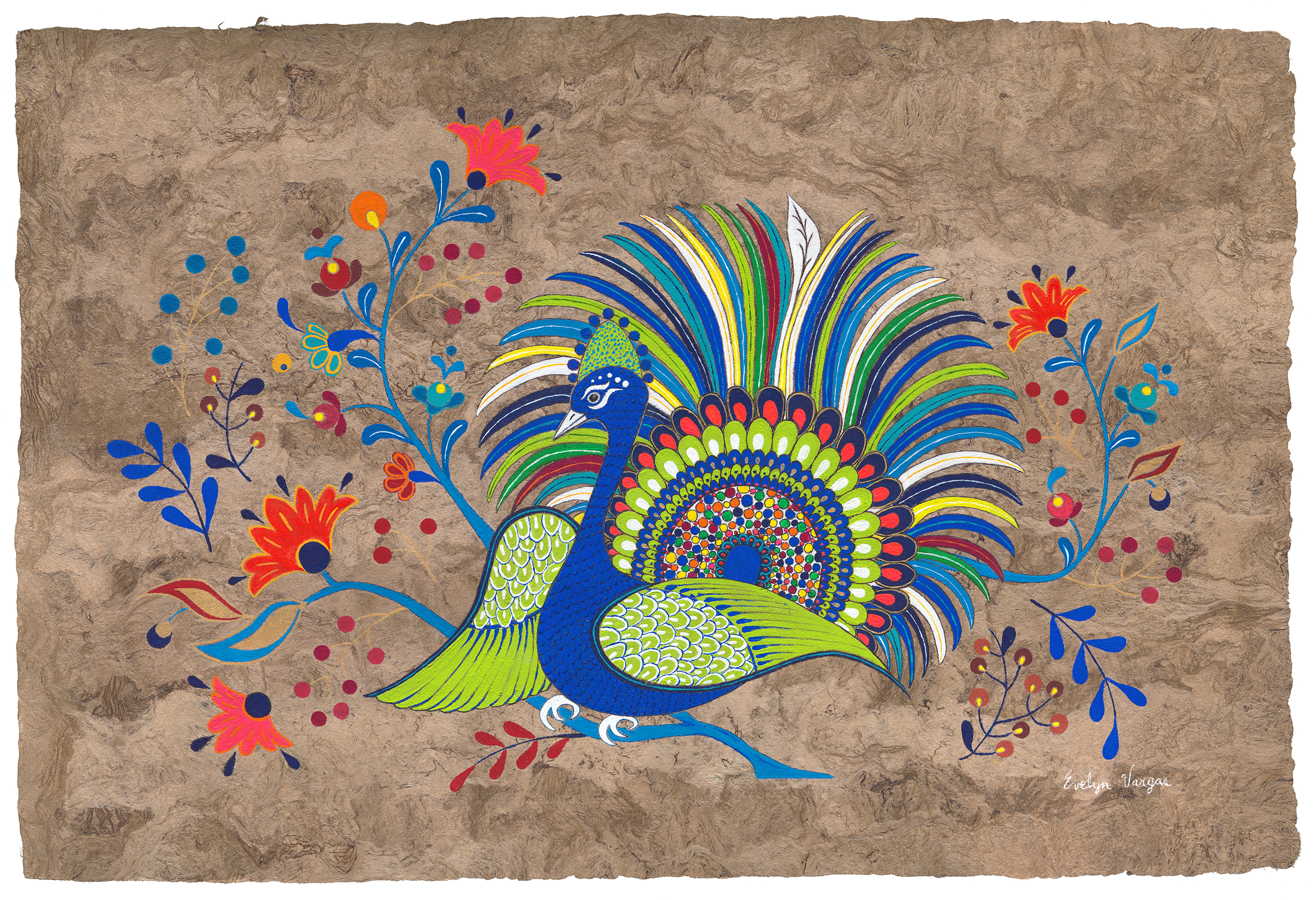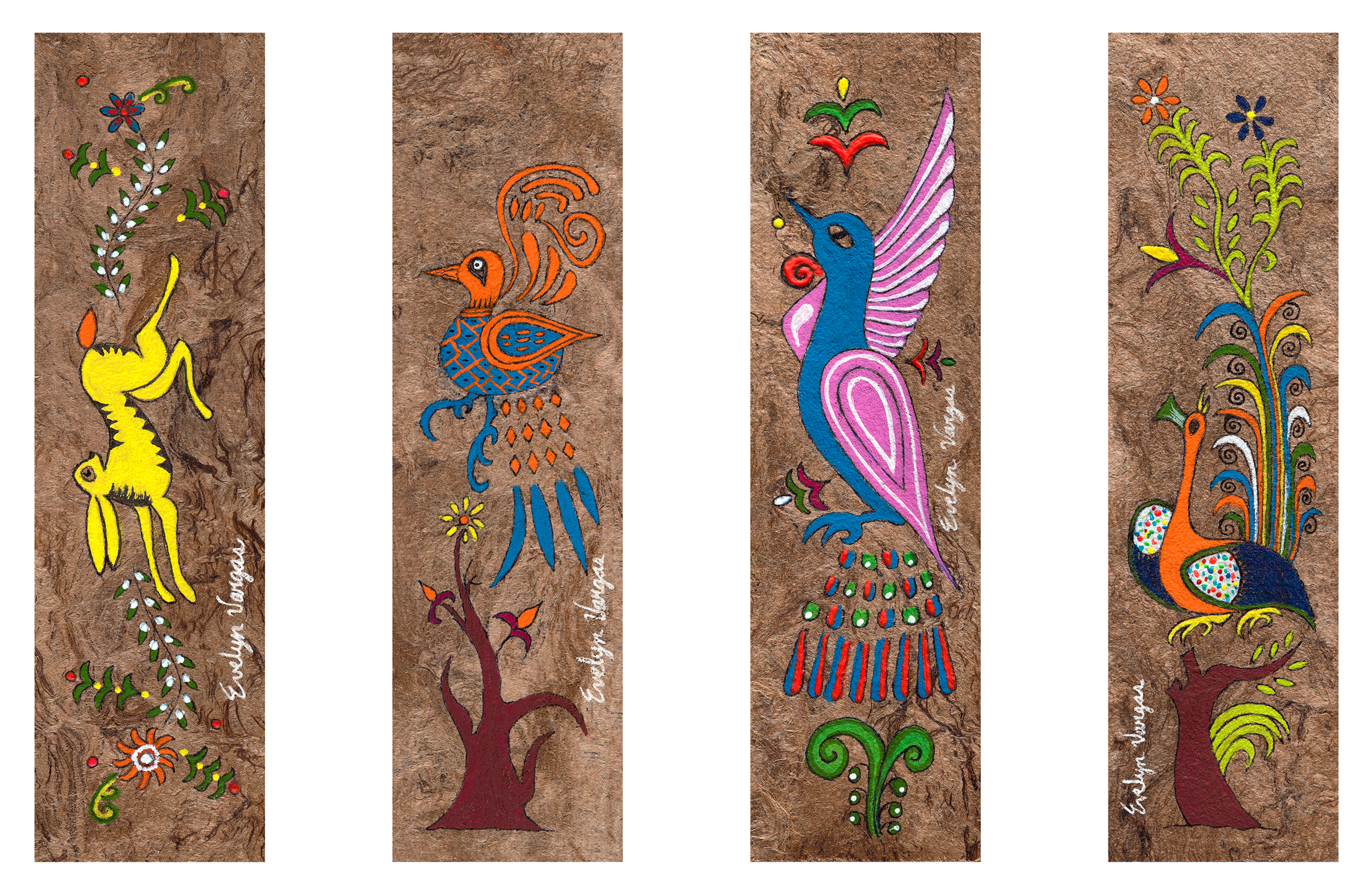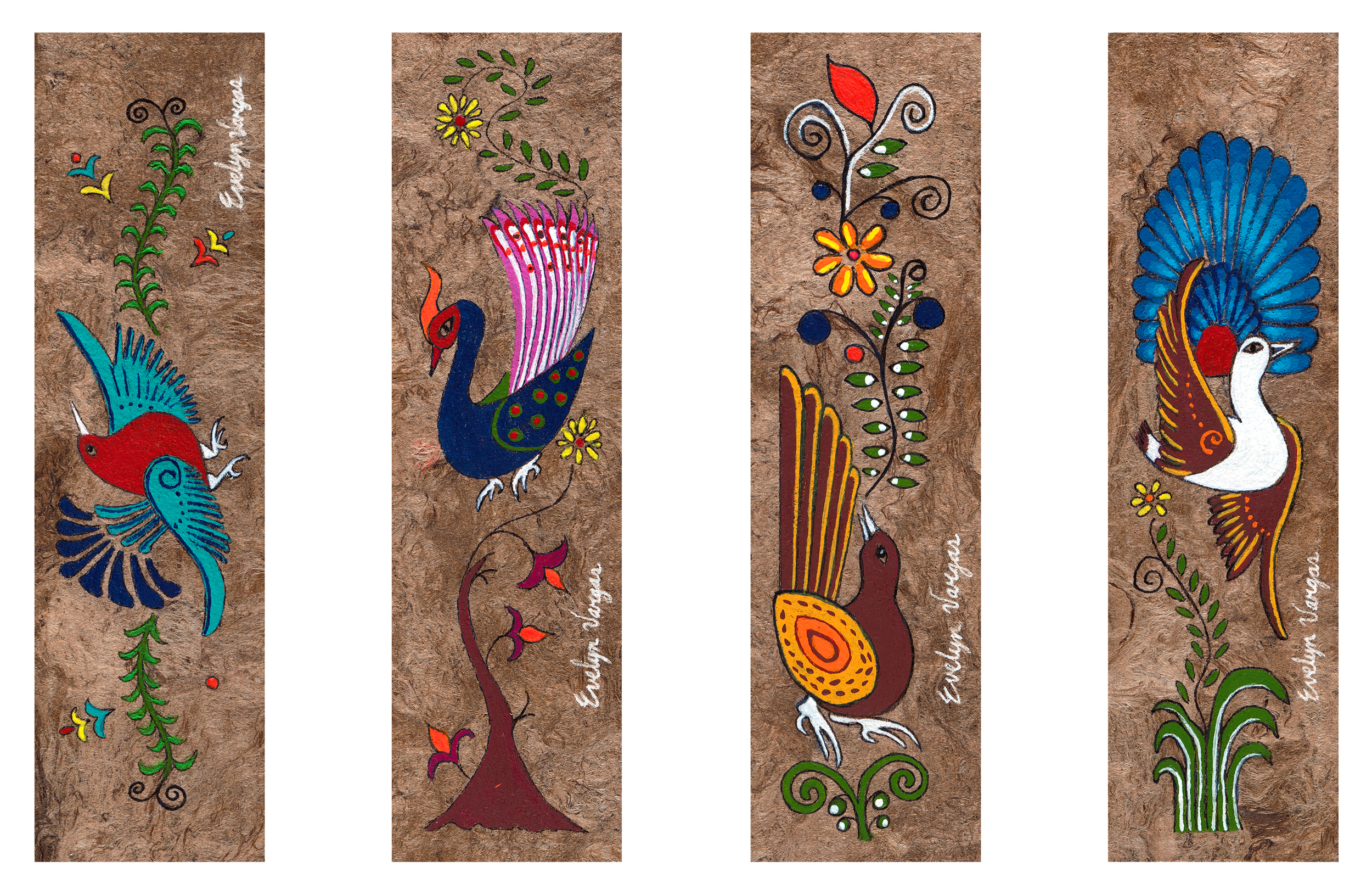 I use amate paper, a bark hand-made paper that was used by Meso-American cultures to create manuscripts. I like to combine the ancient qualities of amate paper with modern materials and techniques such as acrylic. My work is fresh, natural, simple and imaginative which gives it a unique style to share my culture and wonderful artistry with the outside world.